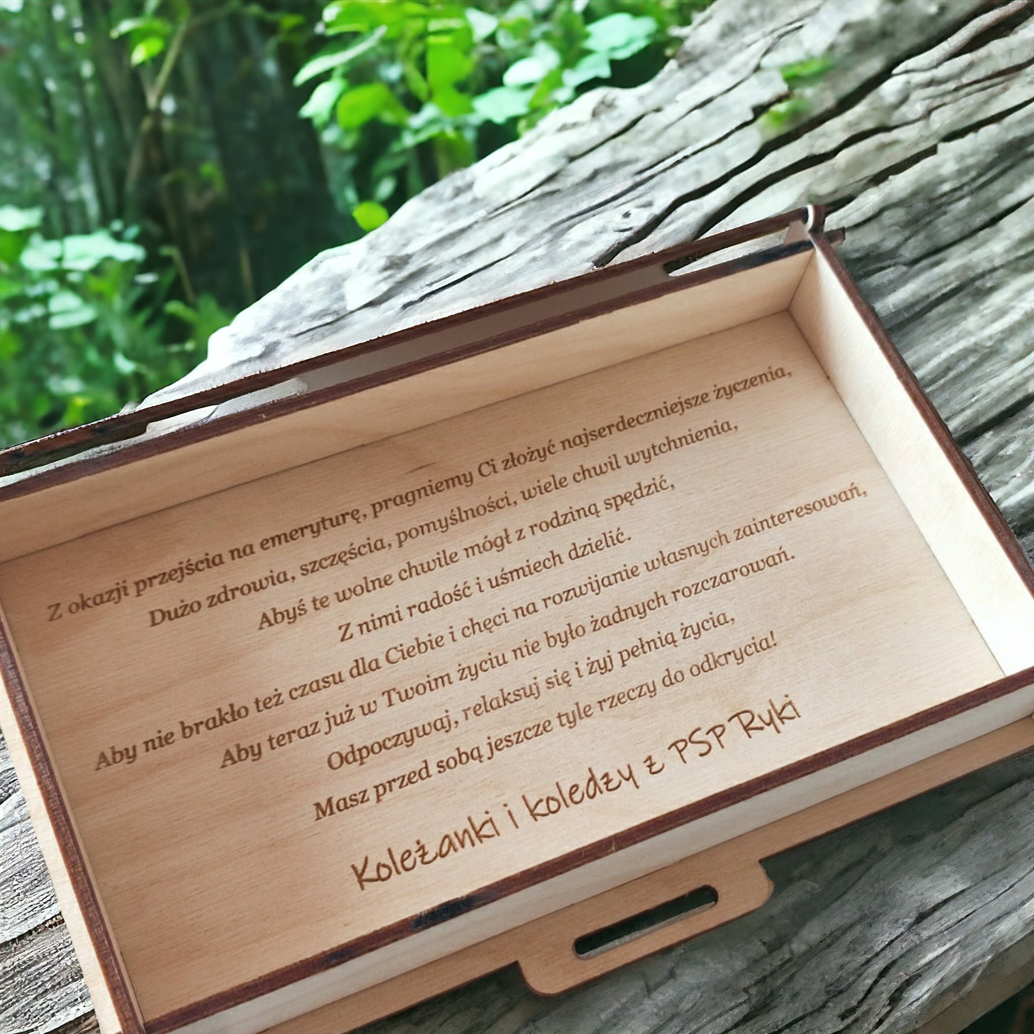 💌 Dodatkowo oferujemy możliwość umieszczenia personalizowanych życzeń wewnątrz pudełka. Twoje słowa, które zostaną na zawsze wyryte w drewnie, sprawią, że pudełko stanie się jeszcze bardziej specjalne.